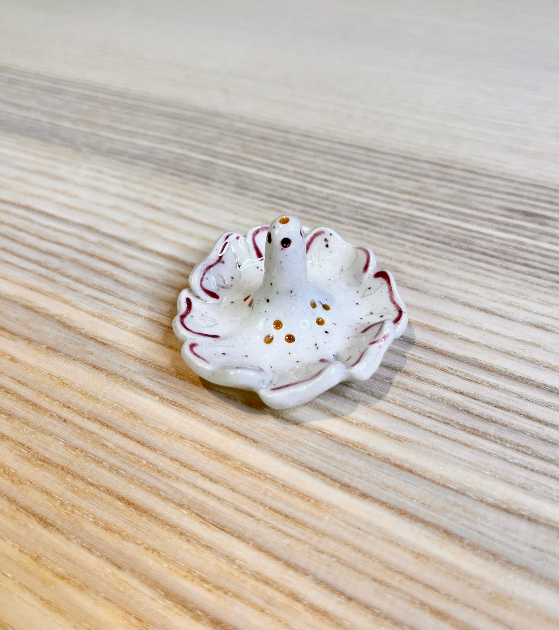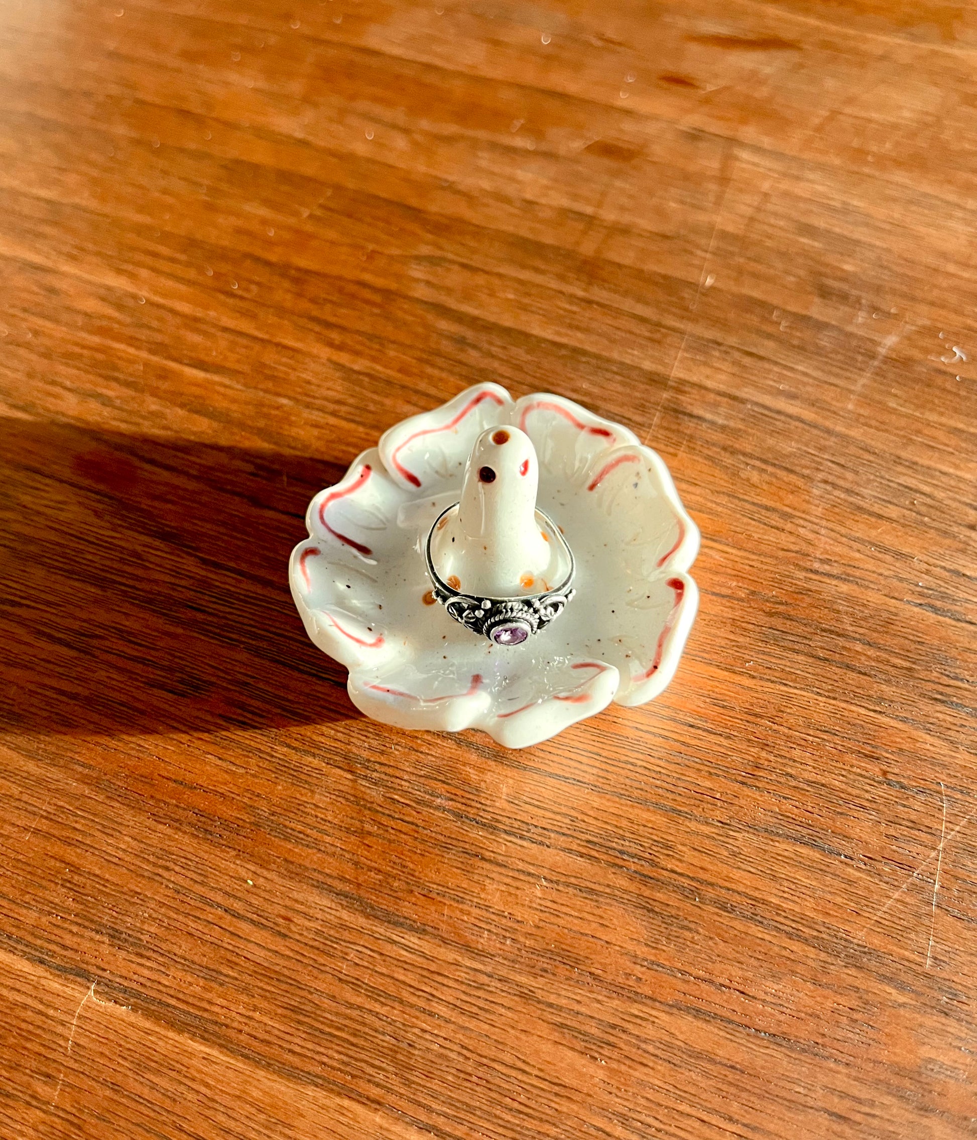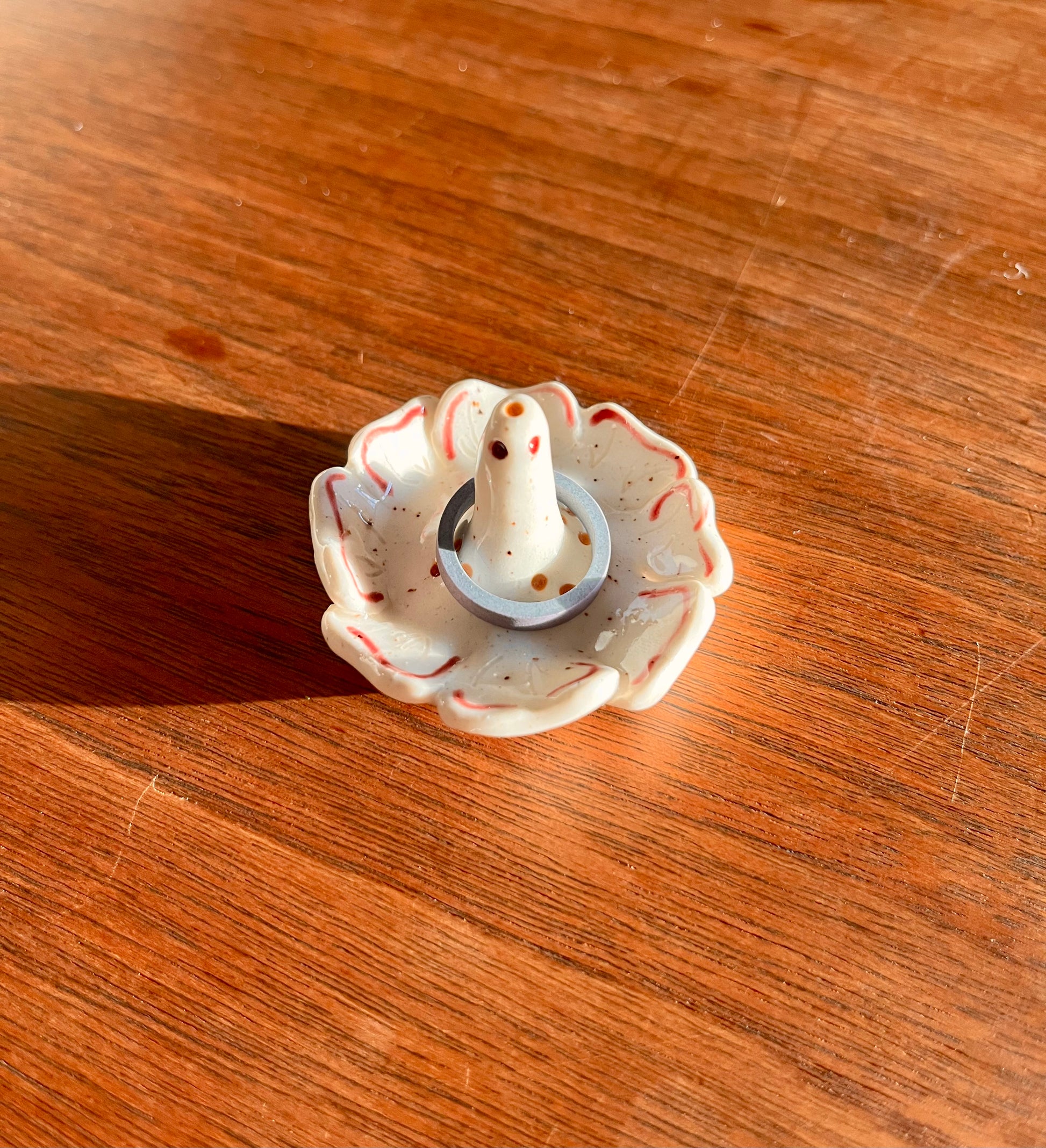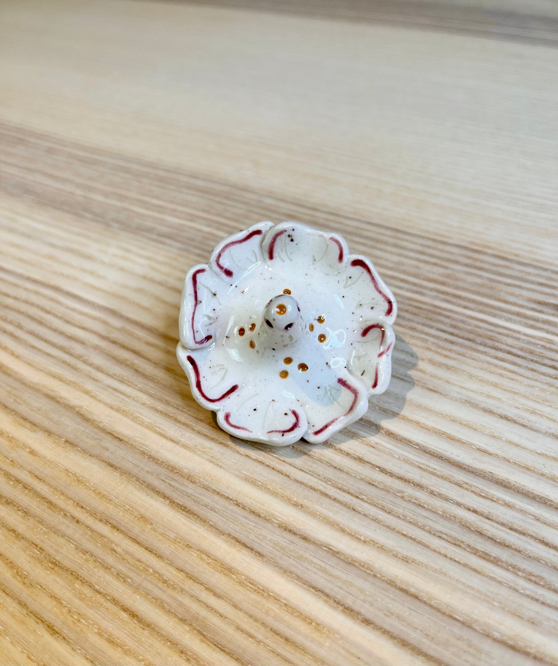 Burgundy lined petals and warm brown spots on a flower ring pot