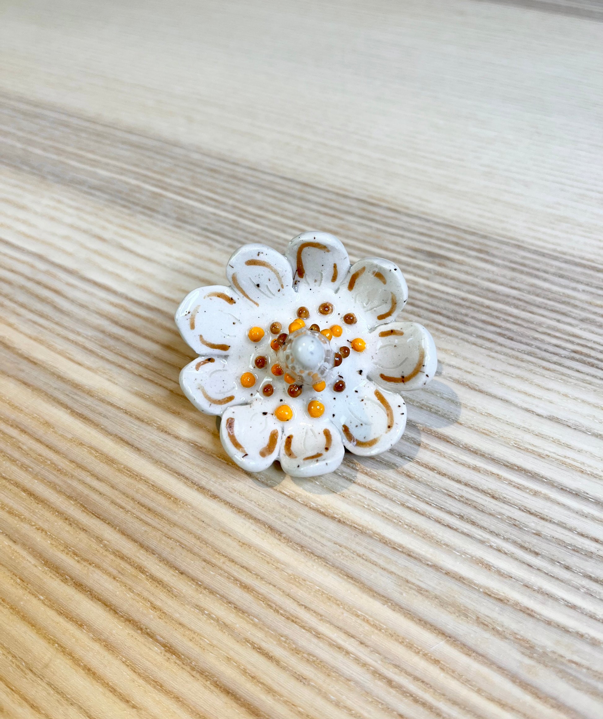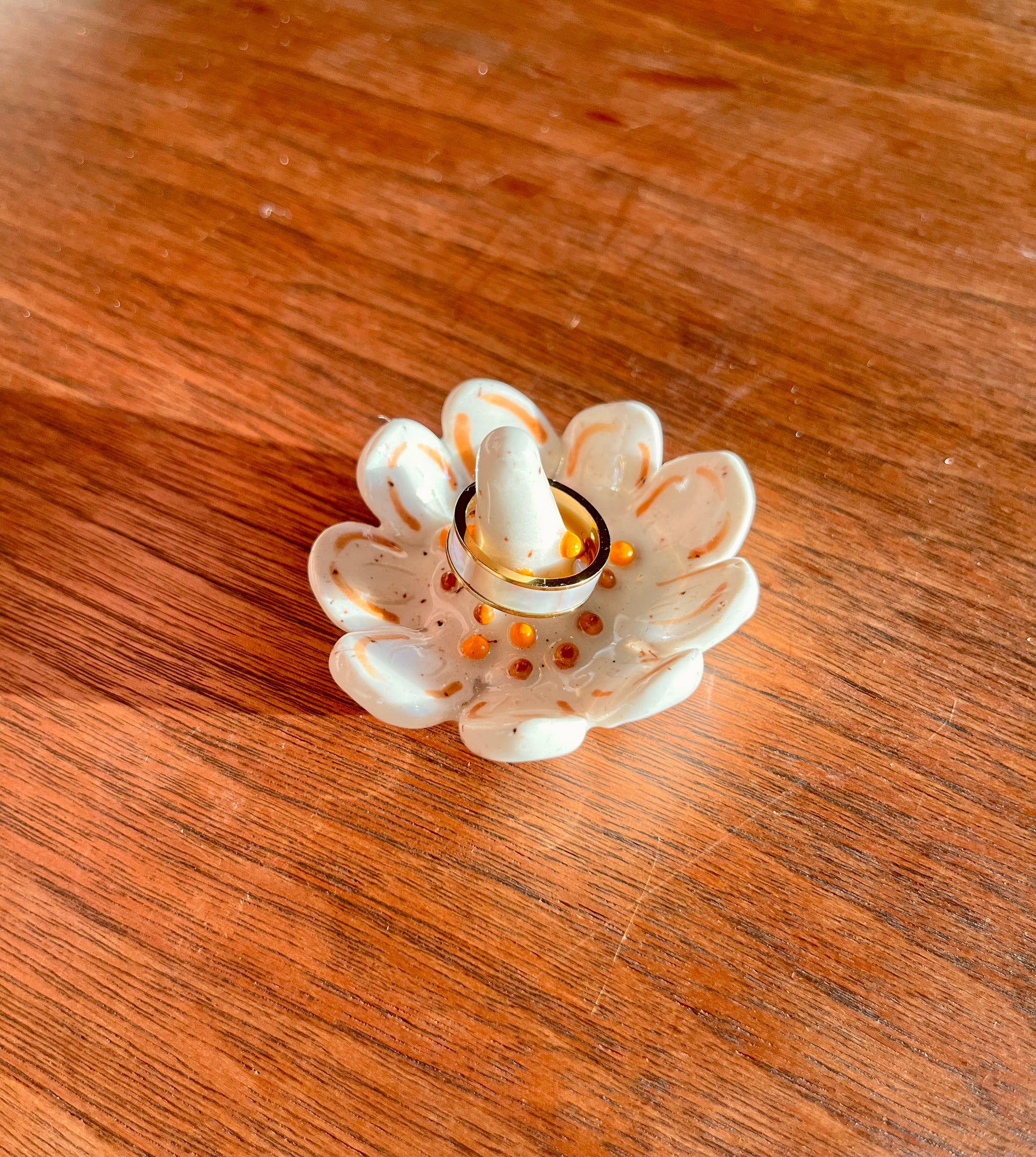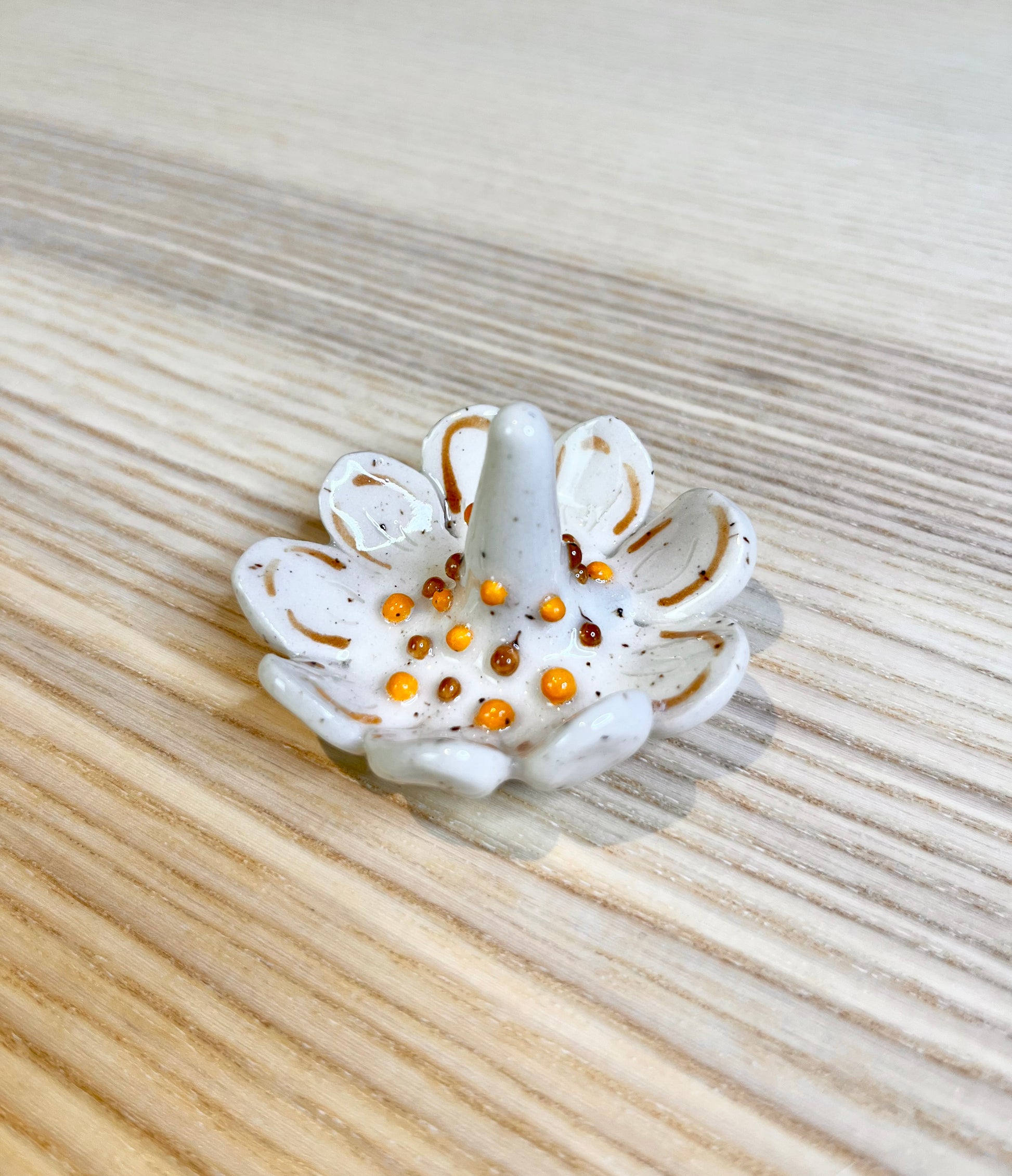 A flower ring pot of brown scalloped petals with orange and brown drops