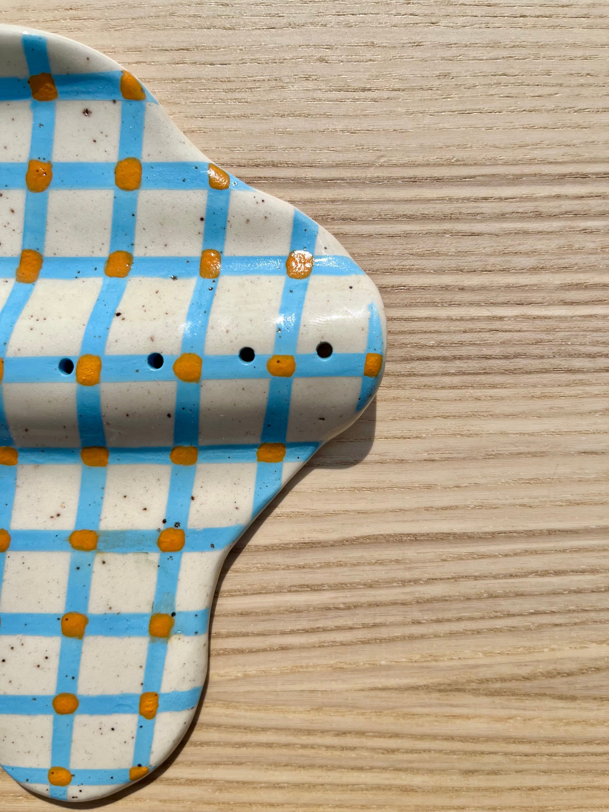 A wavy blue and orange checkered tray with pin holes of earrings; featuring a purple and green flower for rings