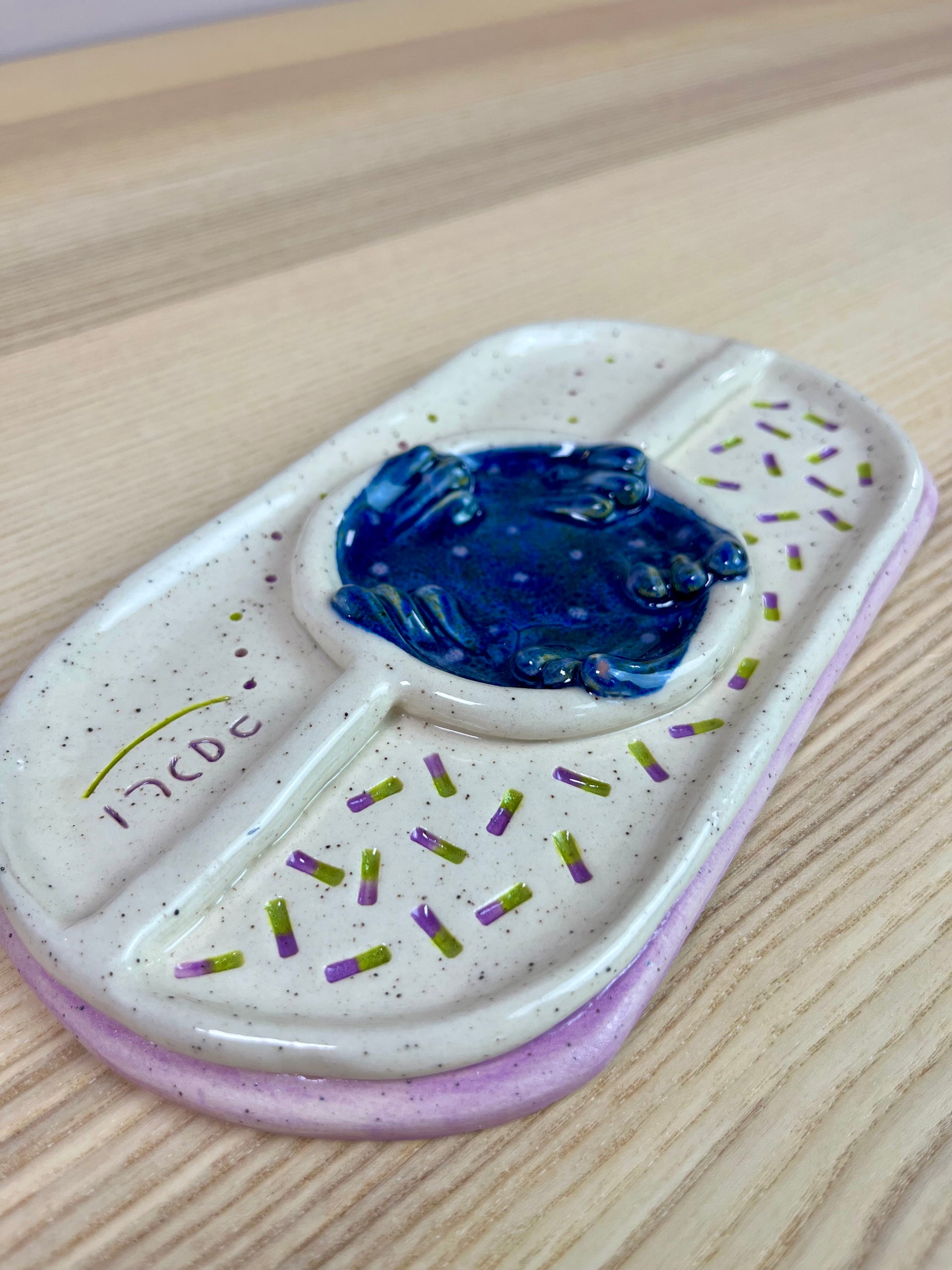 A tray of lavender and bright green confetti, surrounding a churning ocean