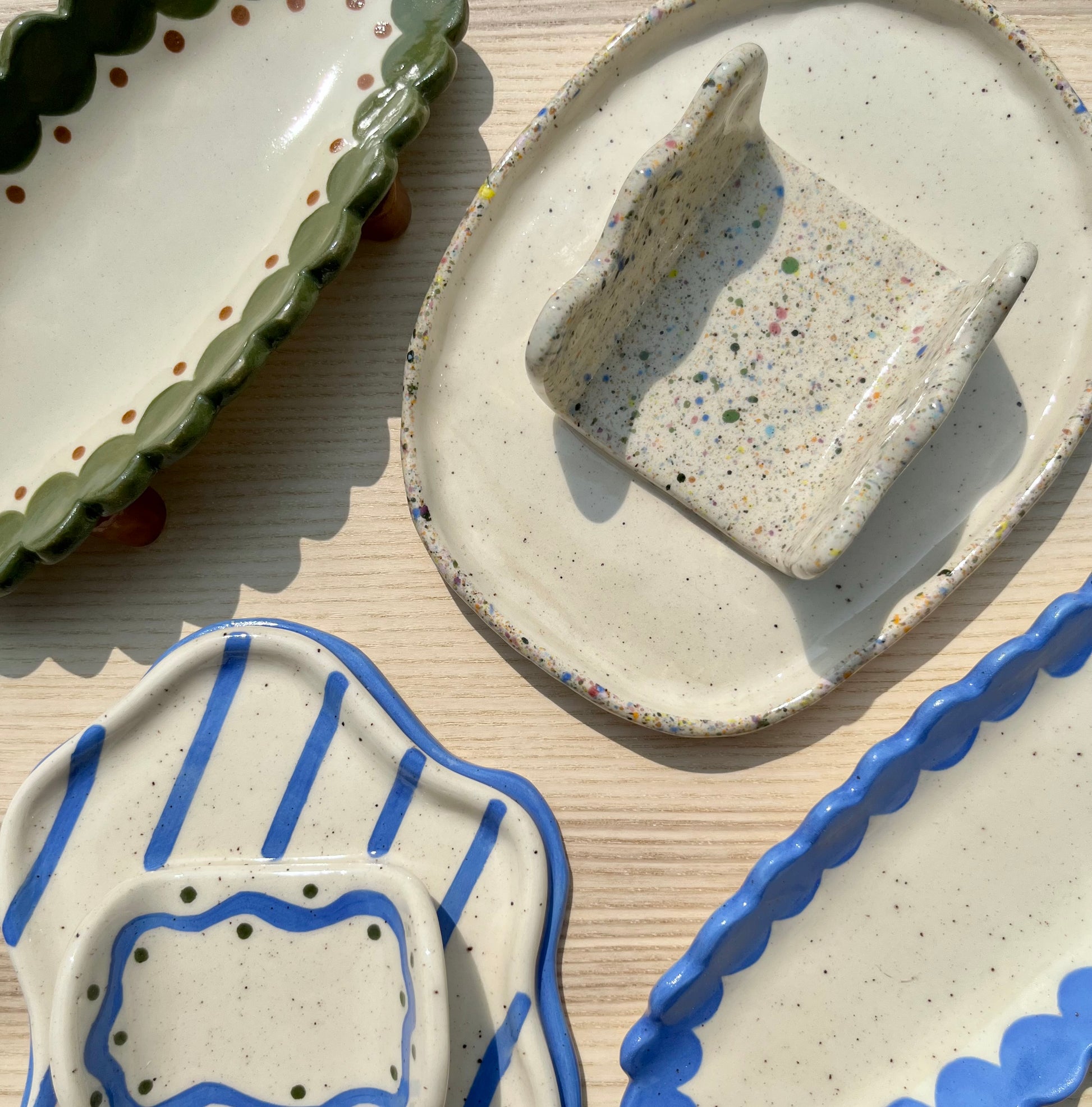 A colourfully speckled hotdog/corm holder