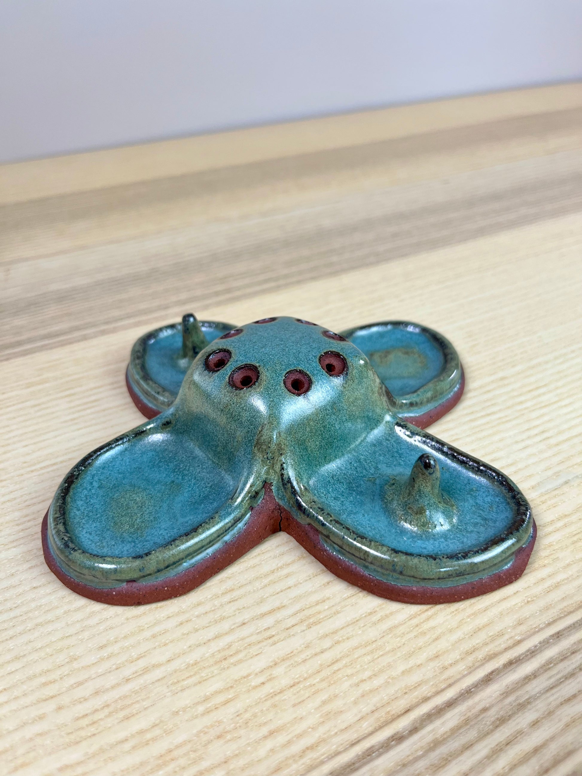 A jalapeño green jewelry tray featuring two ring holders, two bowls and holes for four pairs of earrings