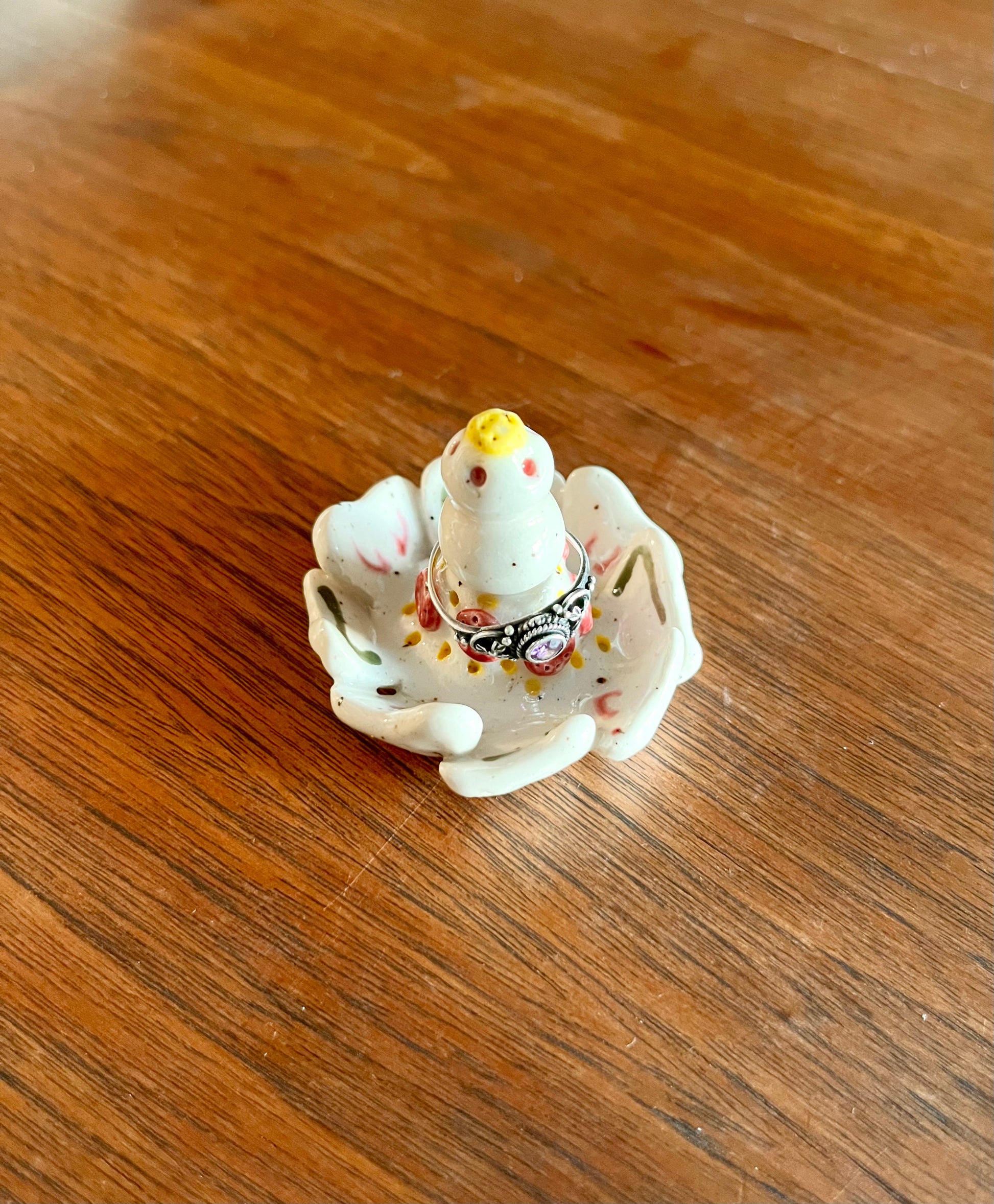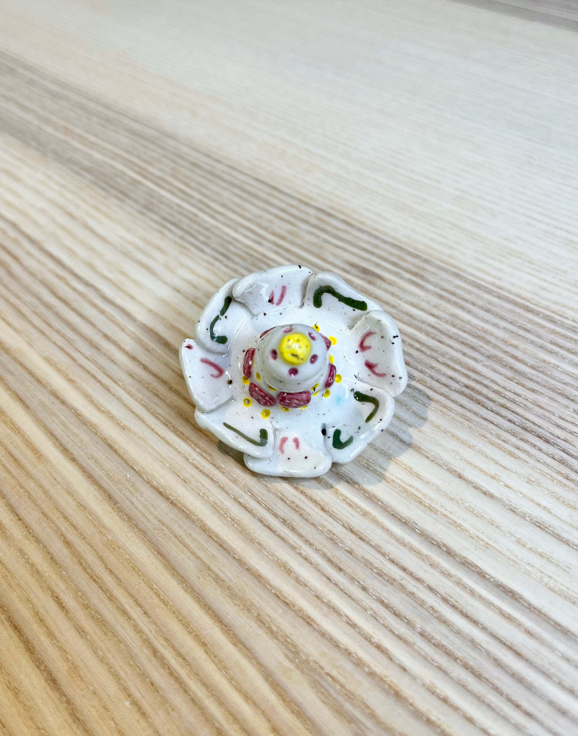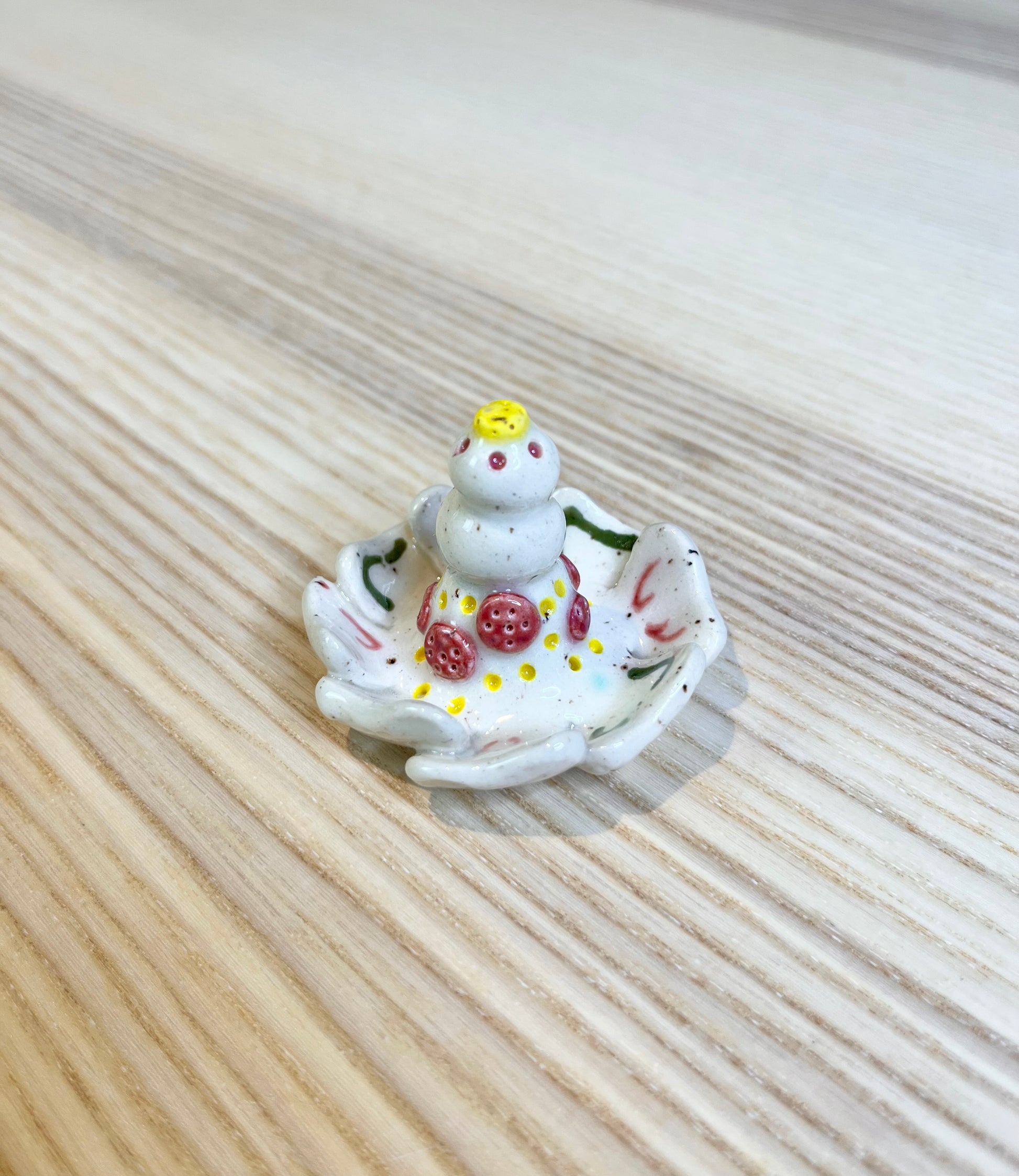 Flower ring pot with olive green petals & pink pods accented with yellow spots and stacked pebbles