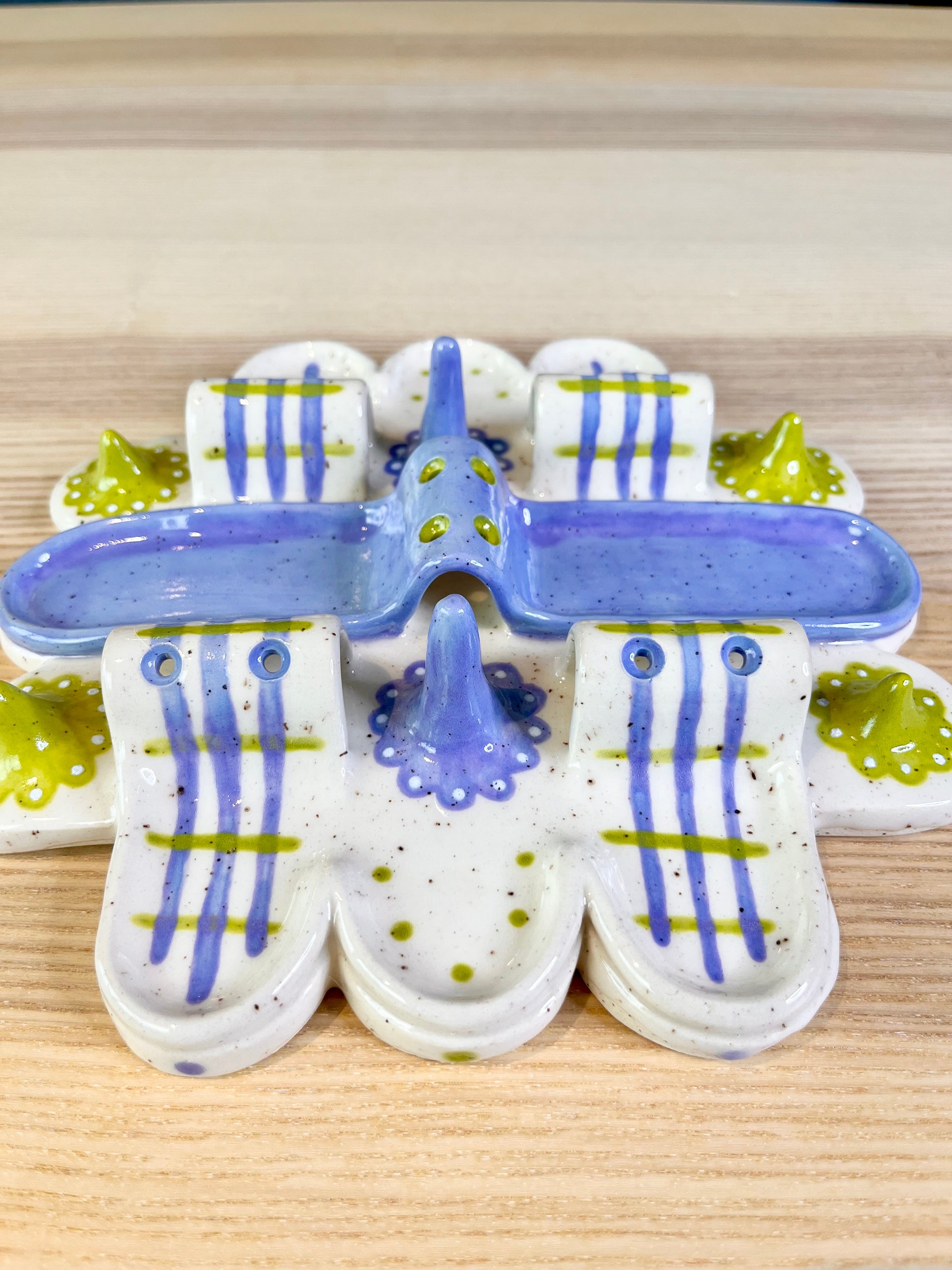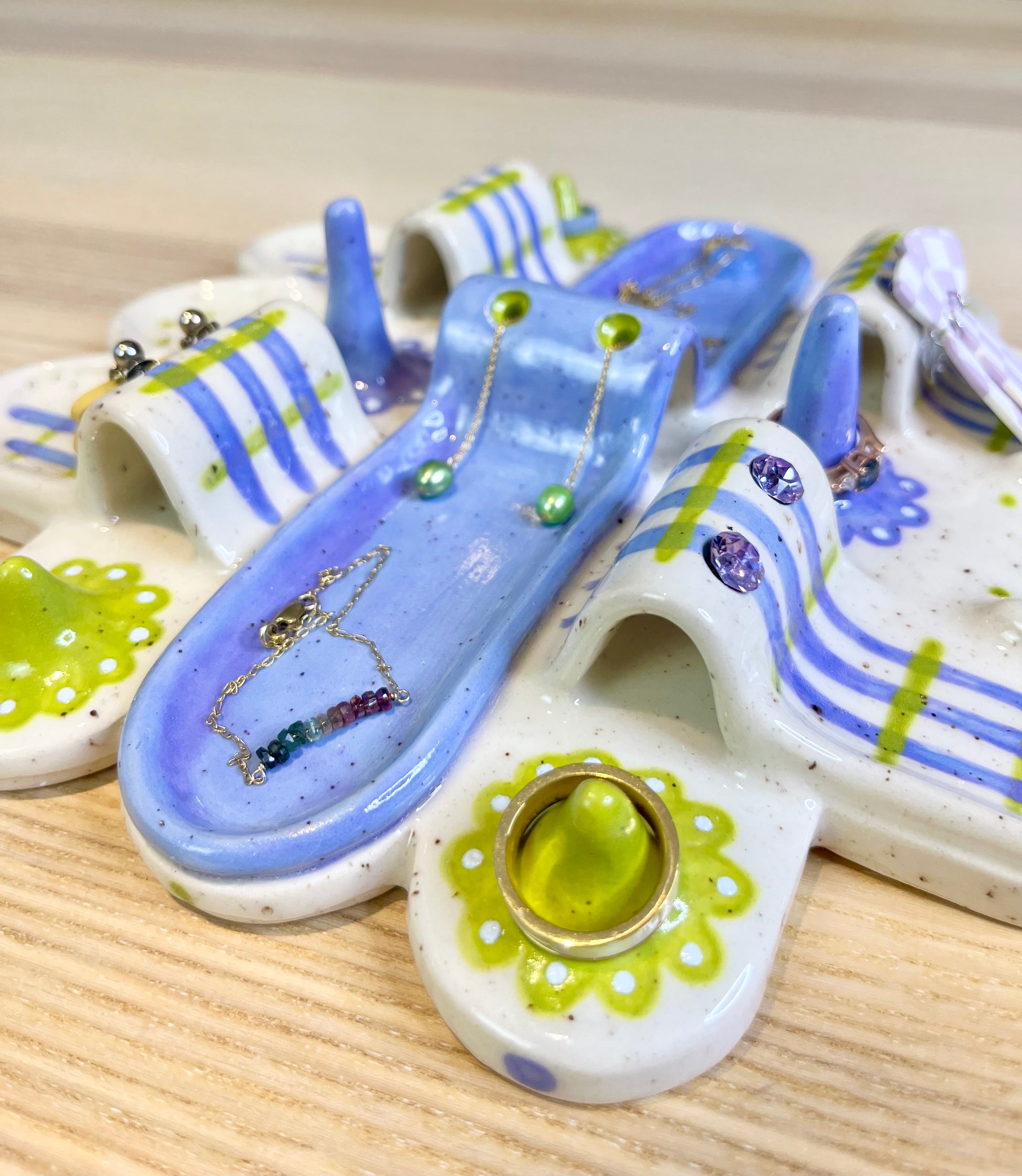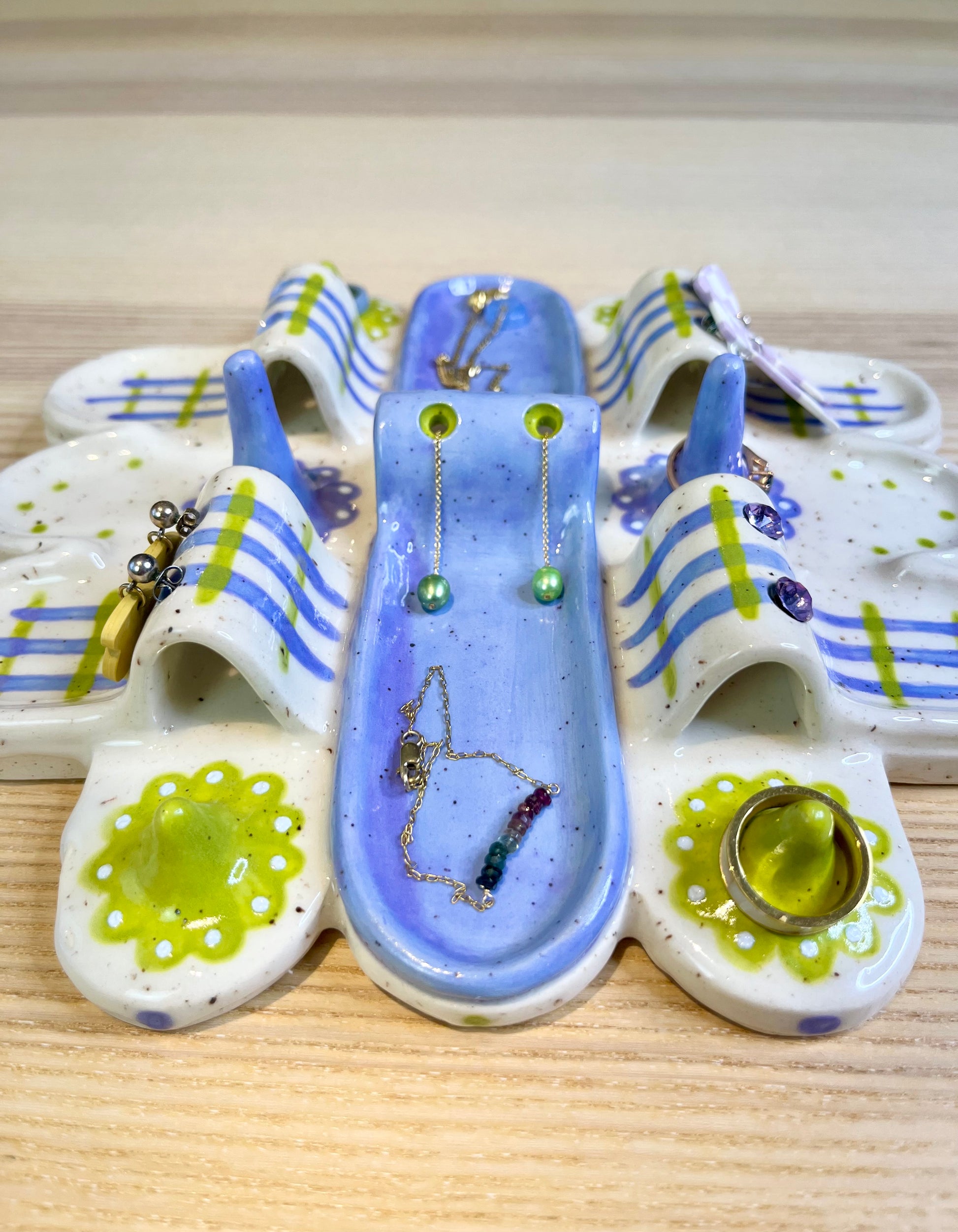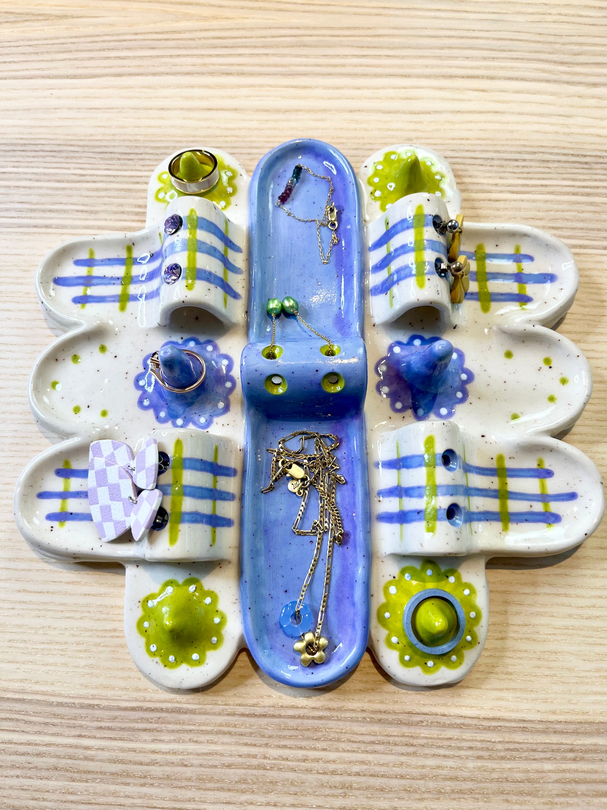 A mini city of lavender and bright green featuring six dedicated ring holders, six earring holders, and 8 compartments for an array of pieces