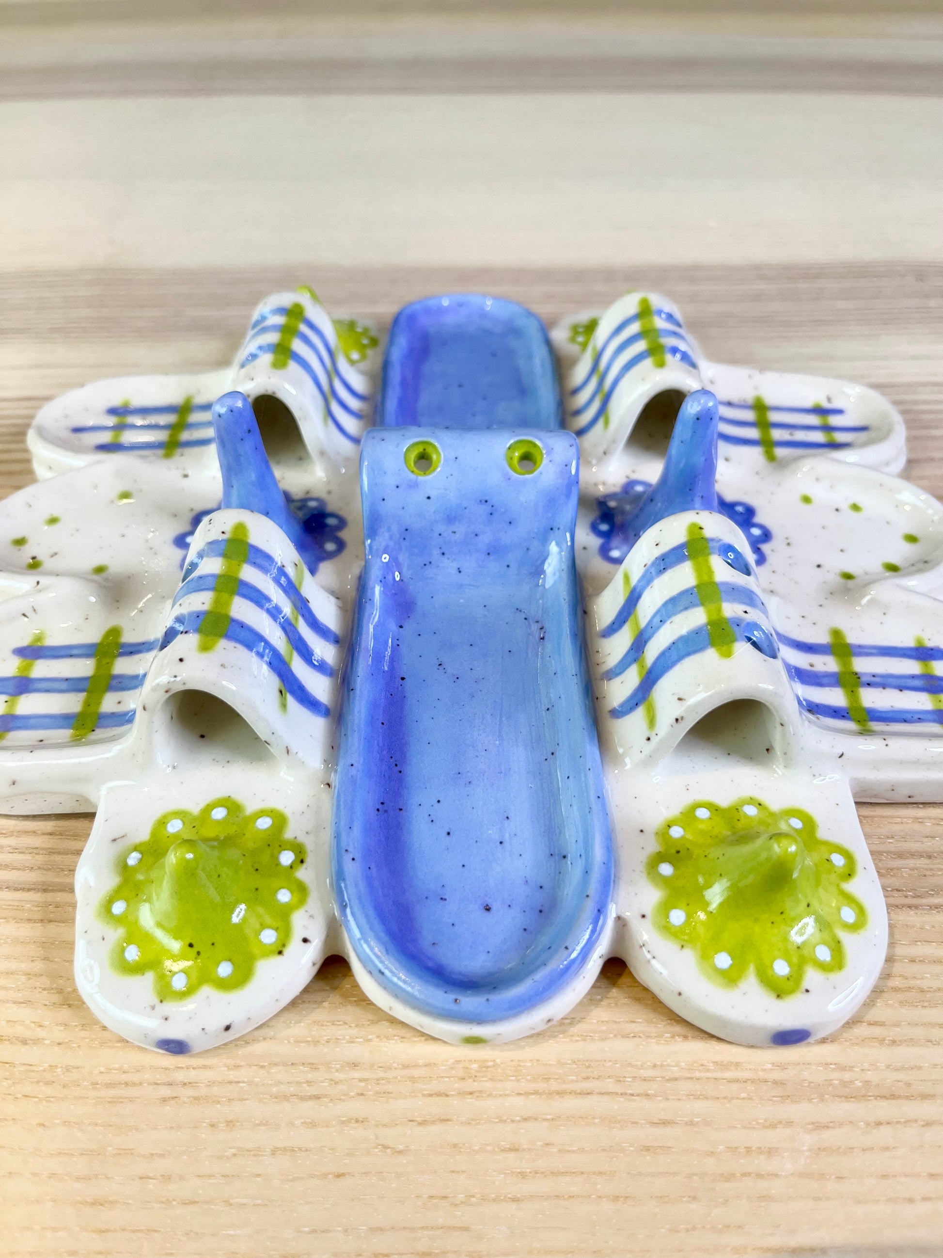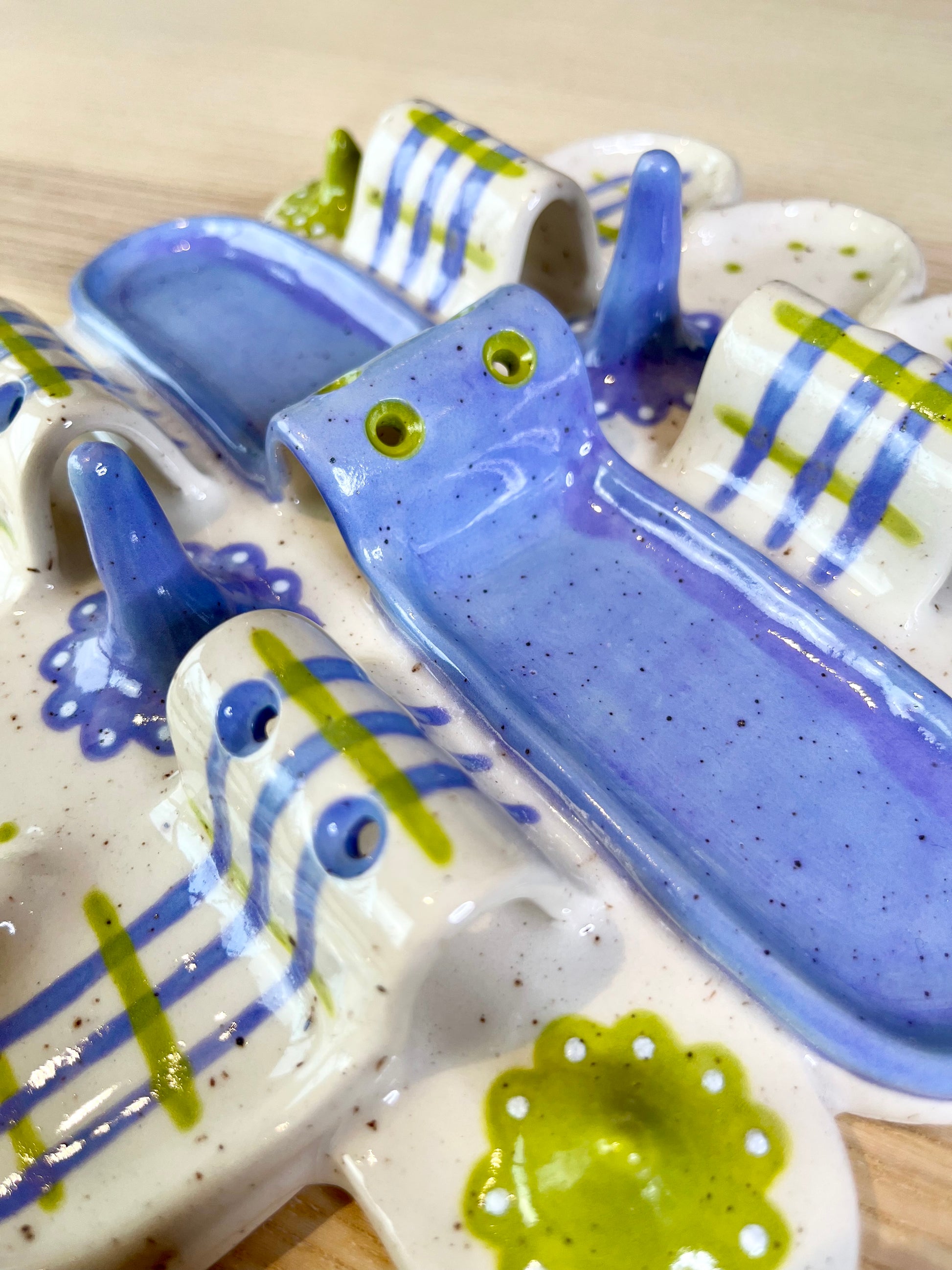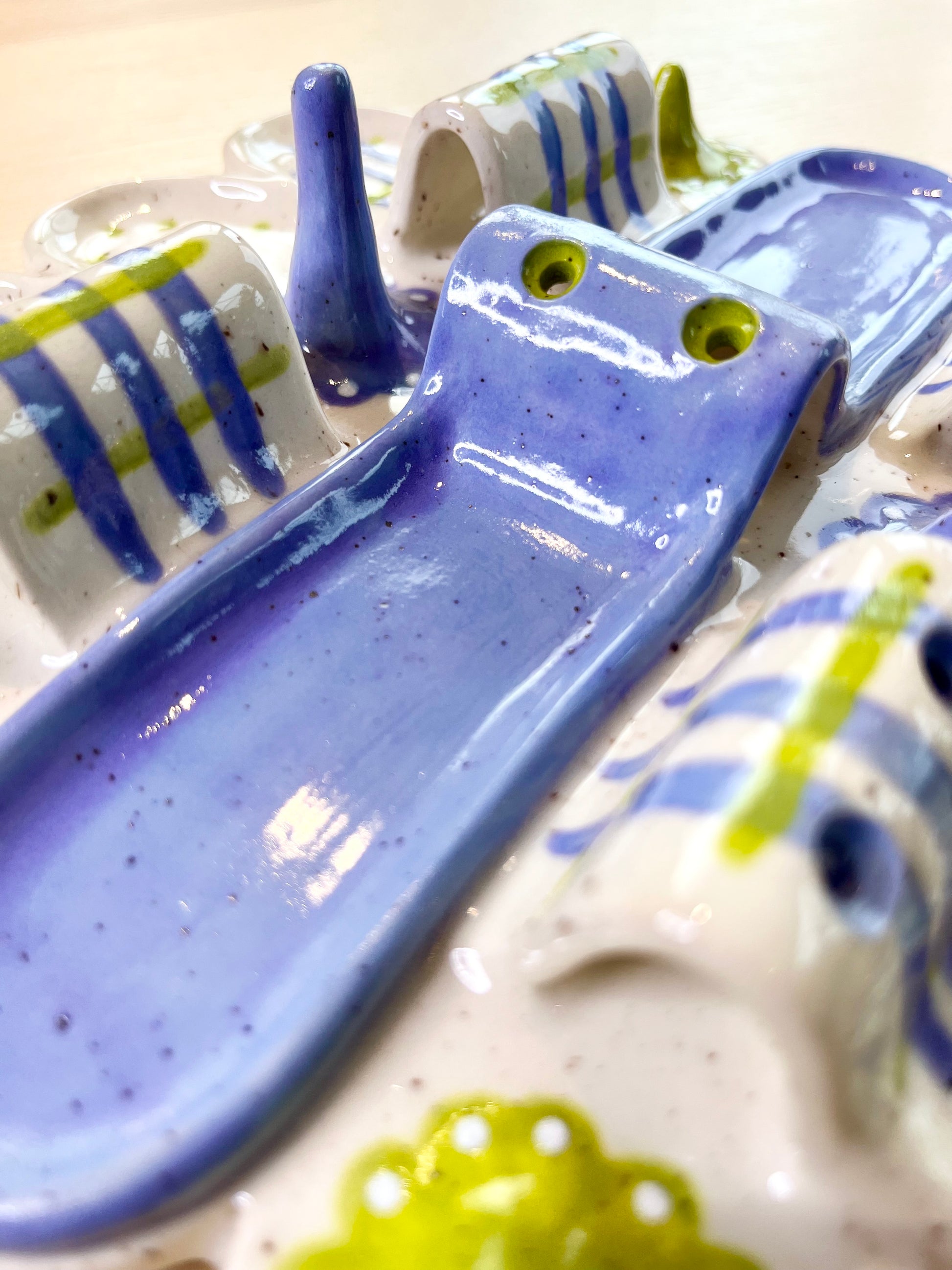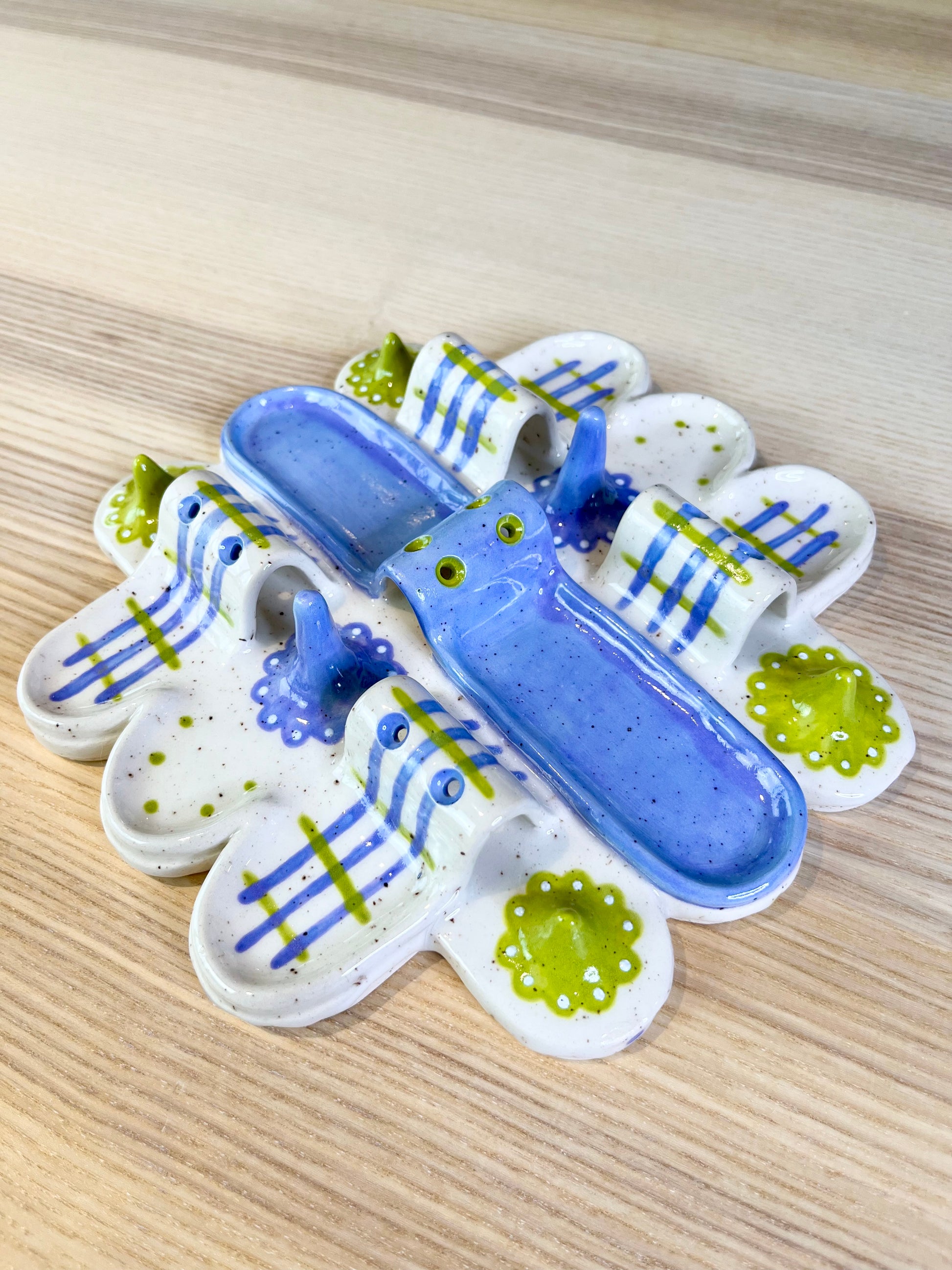 A mini city of lavender and bright green featuring six dedicated ring holders, six earring holders, and 8 compartments for an array of pieces