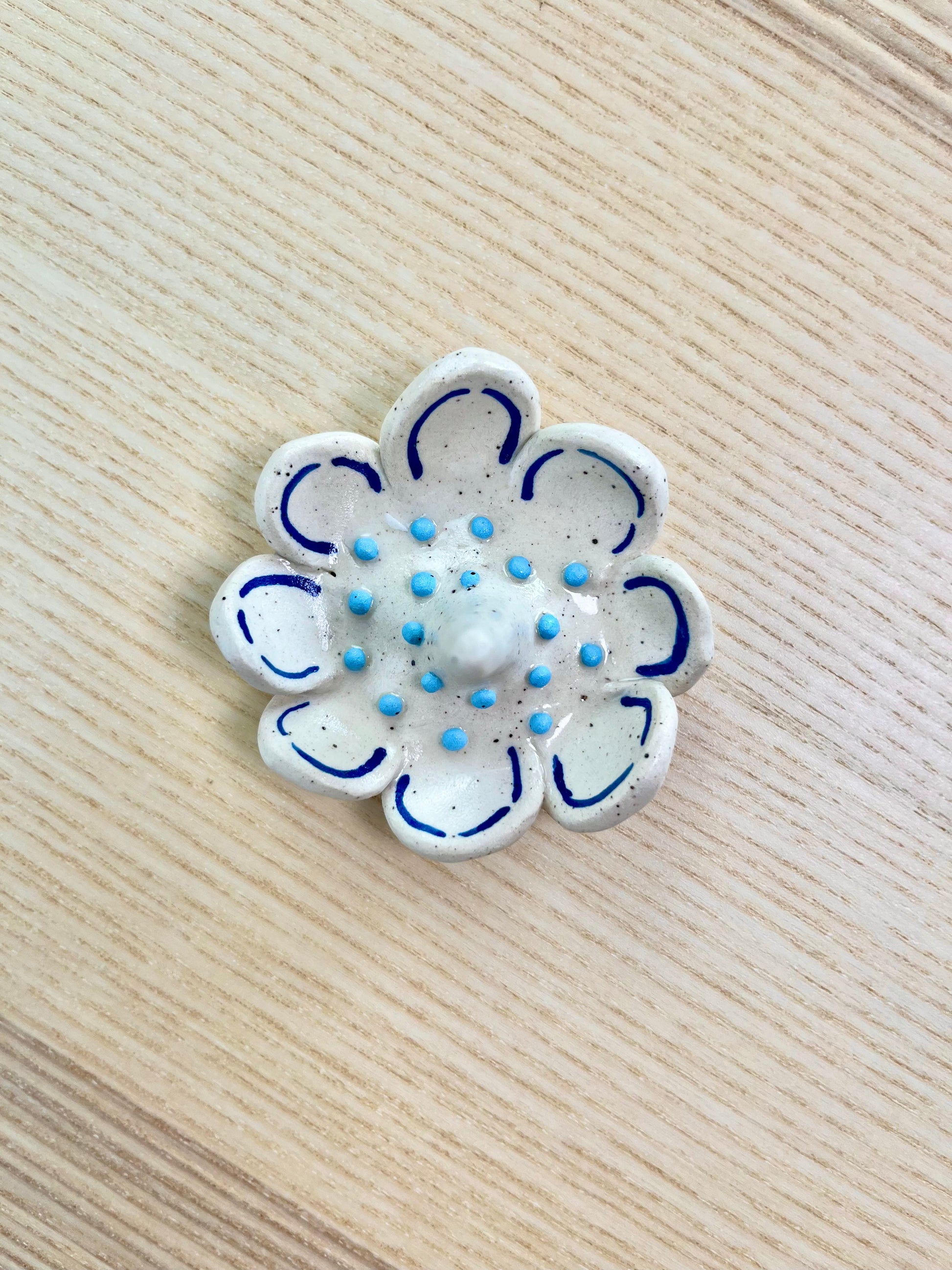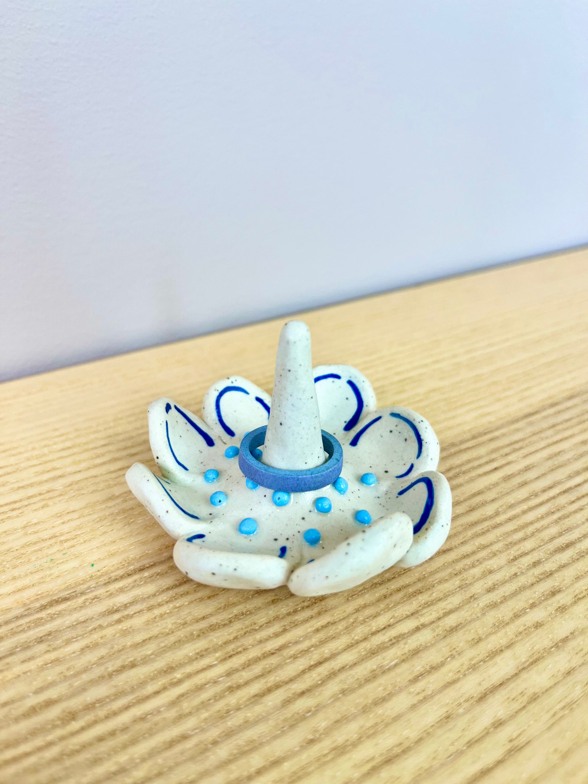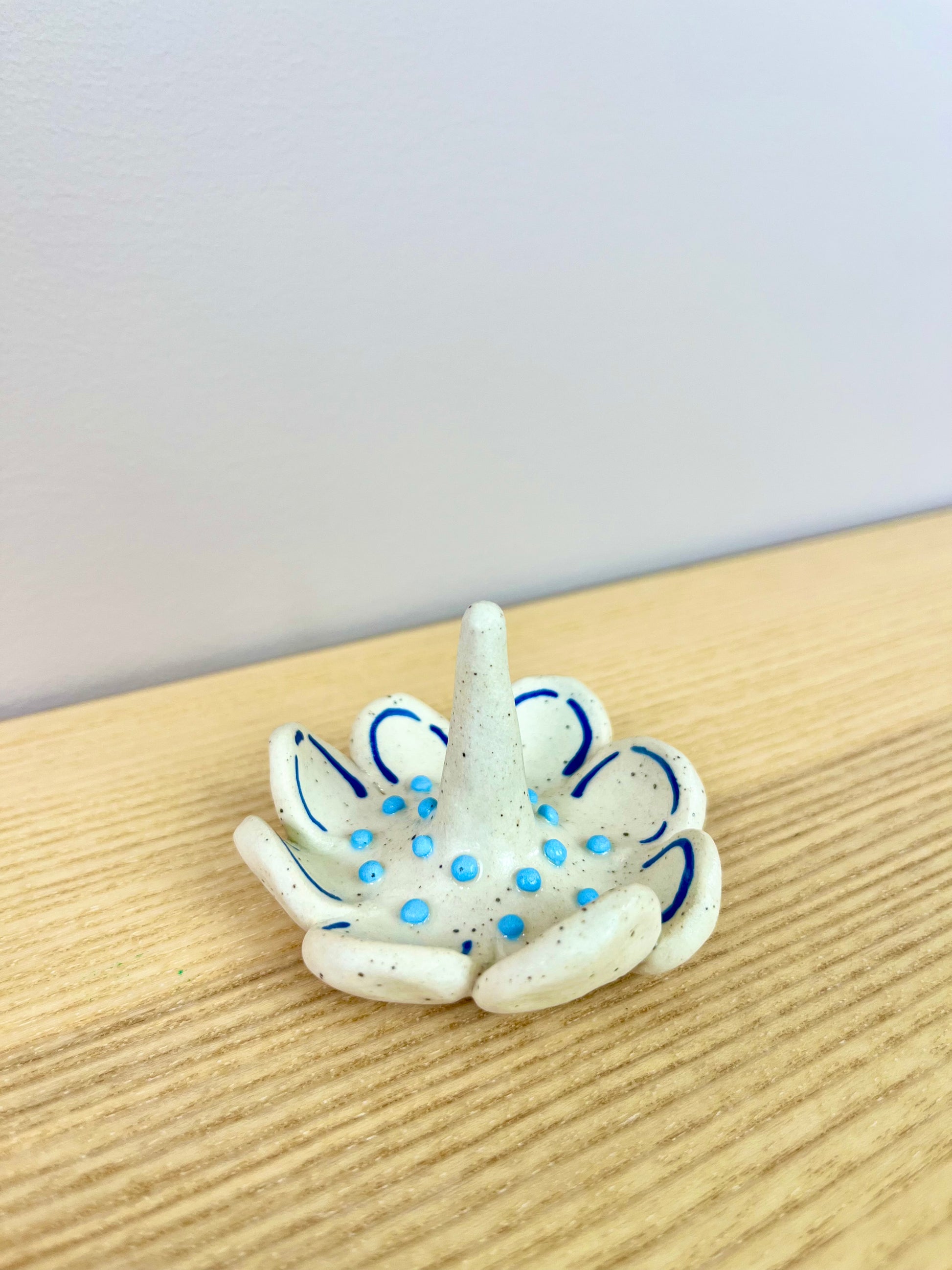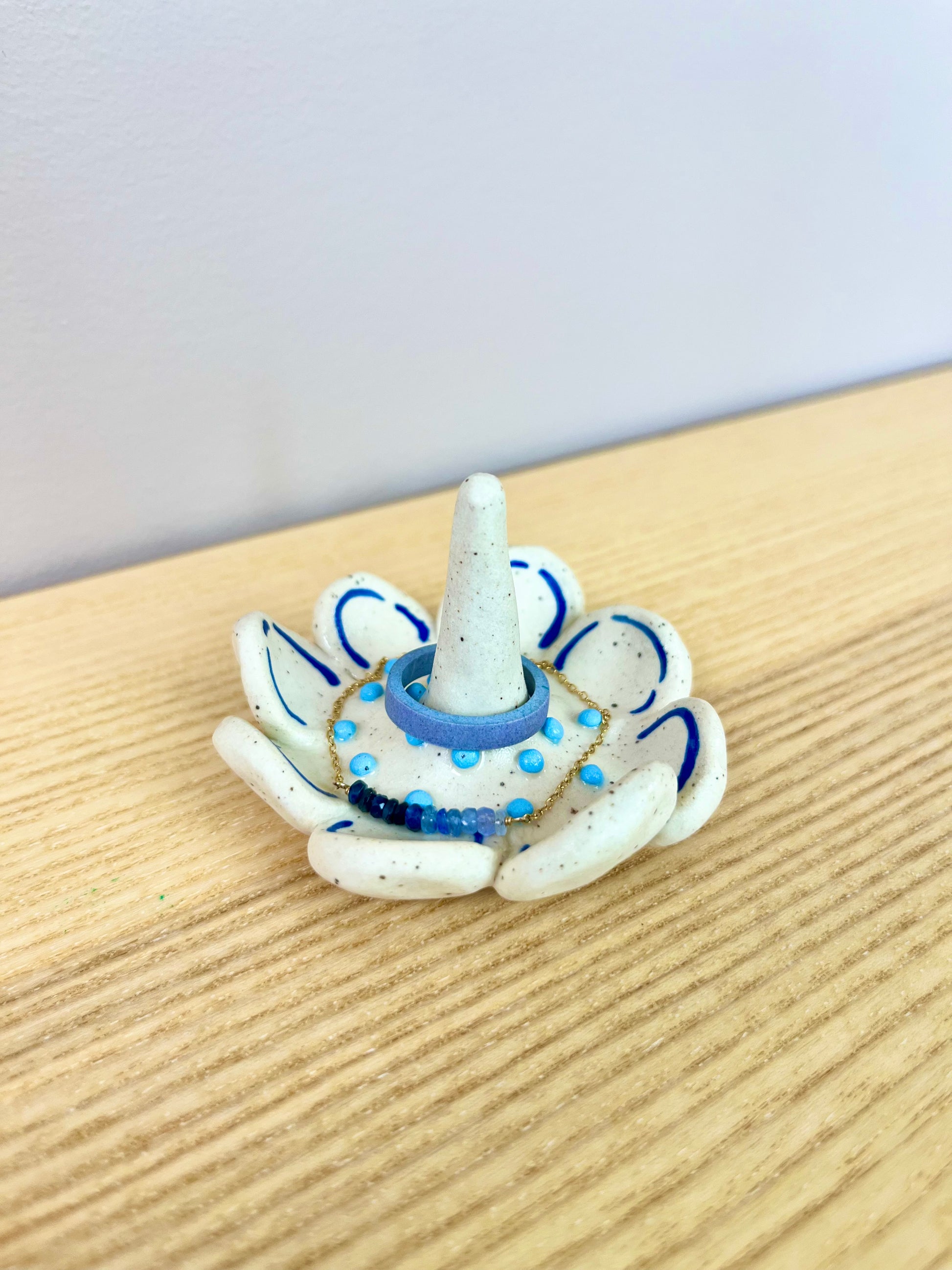A ring flower pot with bright blue drops and petals lined in dark blue