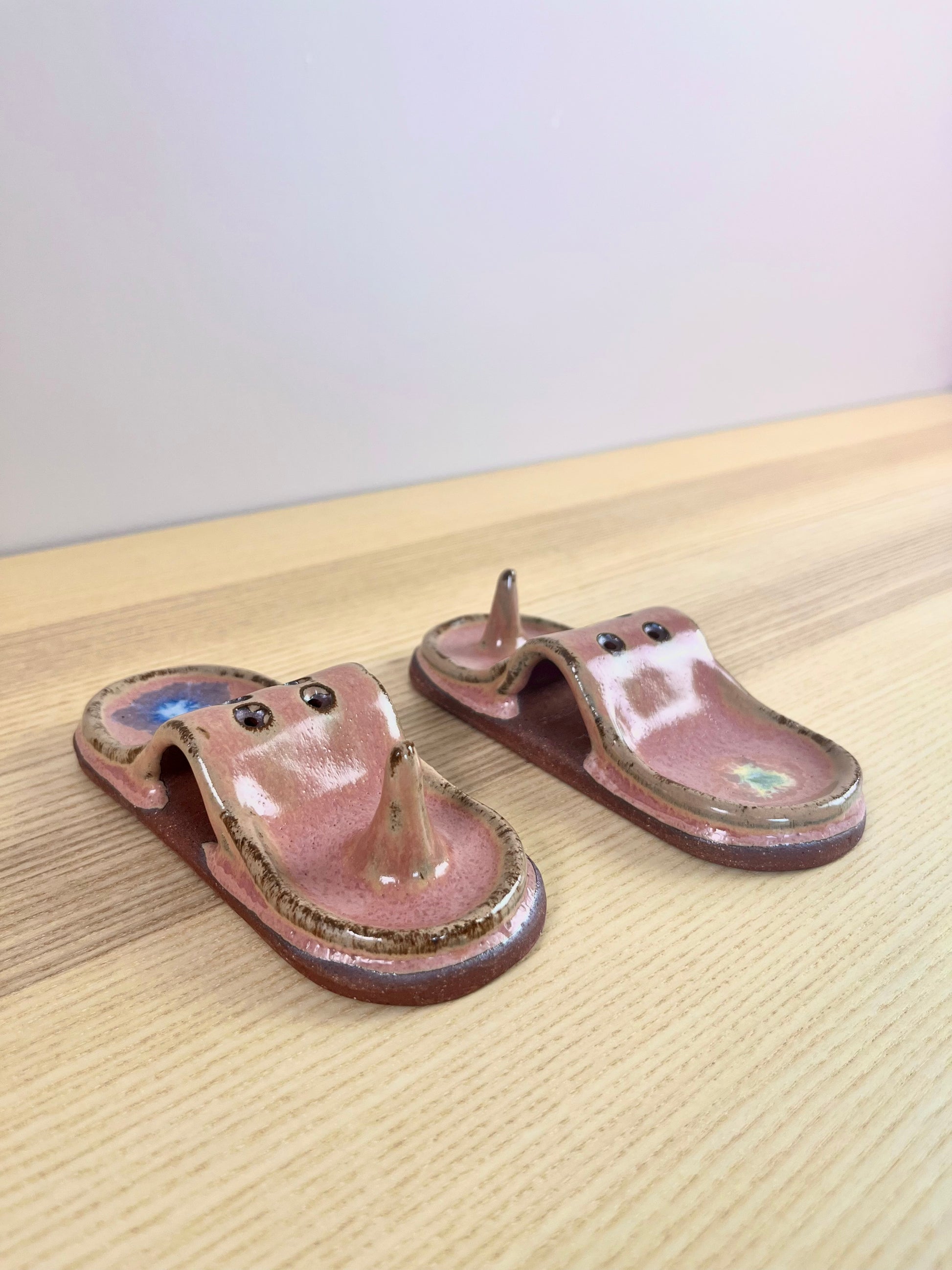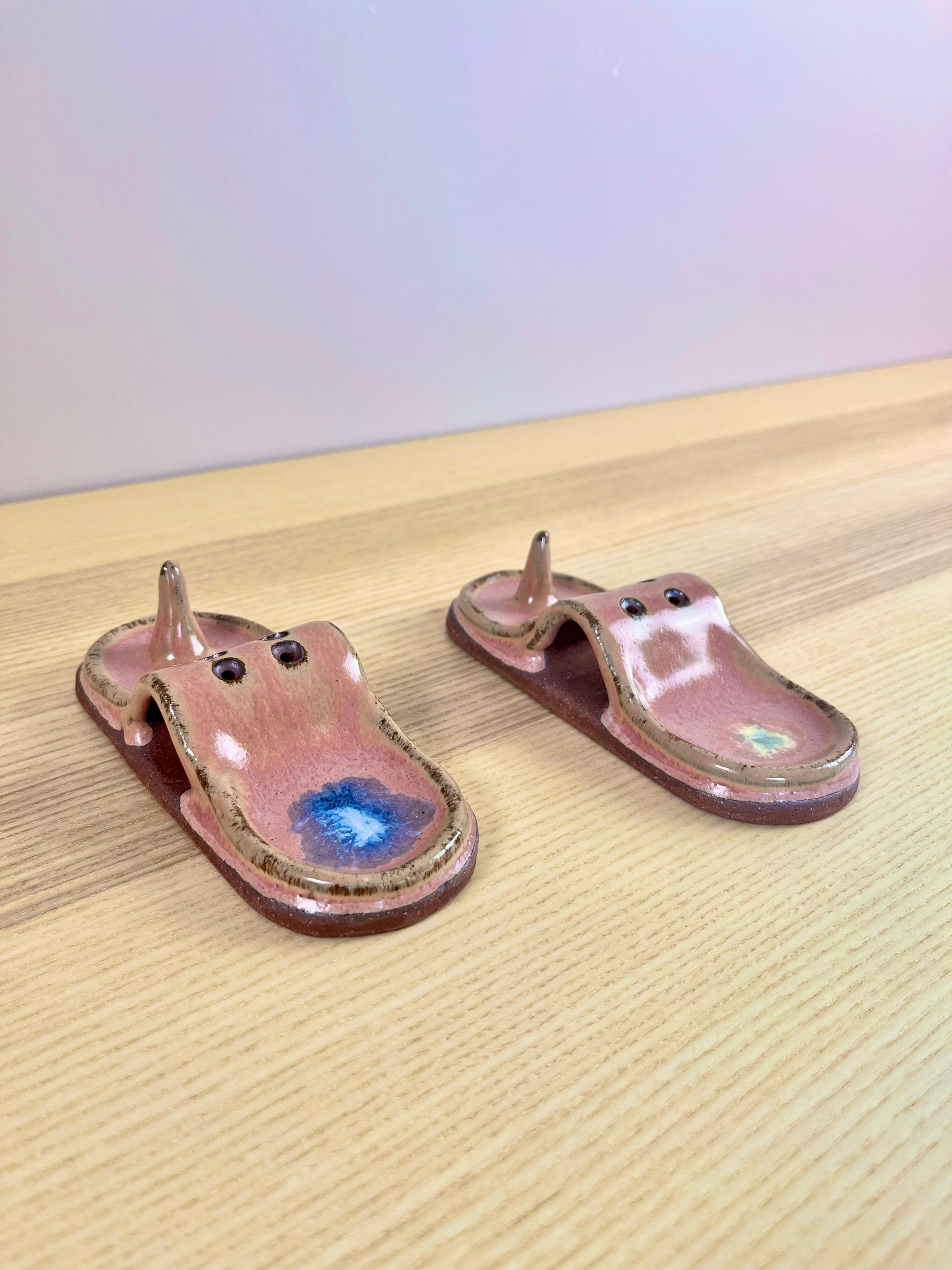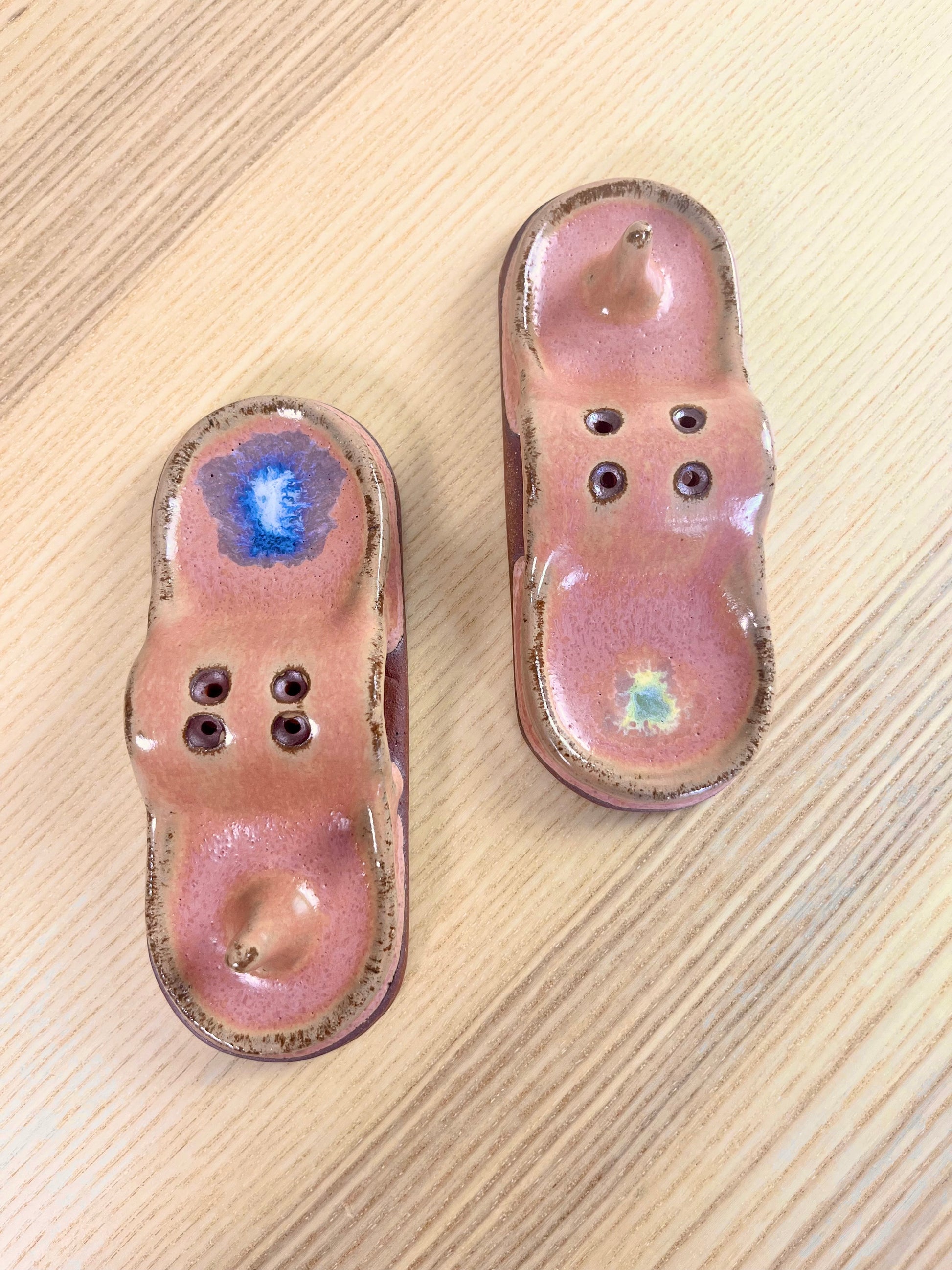 A pair of pink jewelry trays. Each with a ring turret, four holes for two pairs of earrings, and small sunken dish