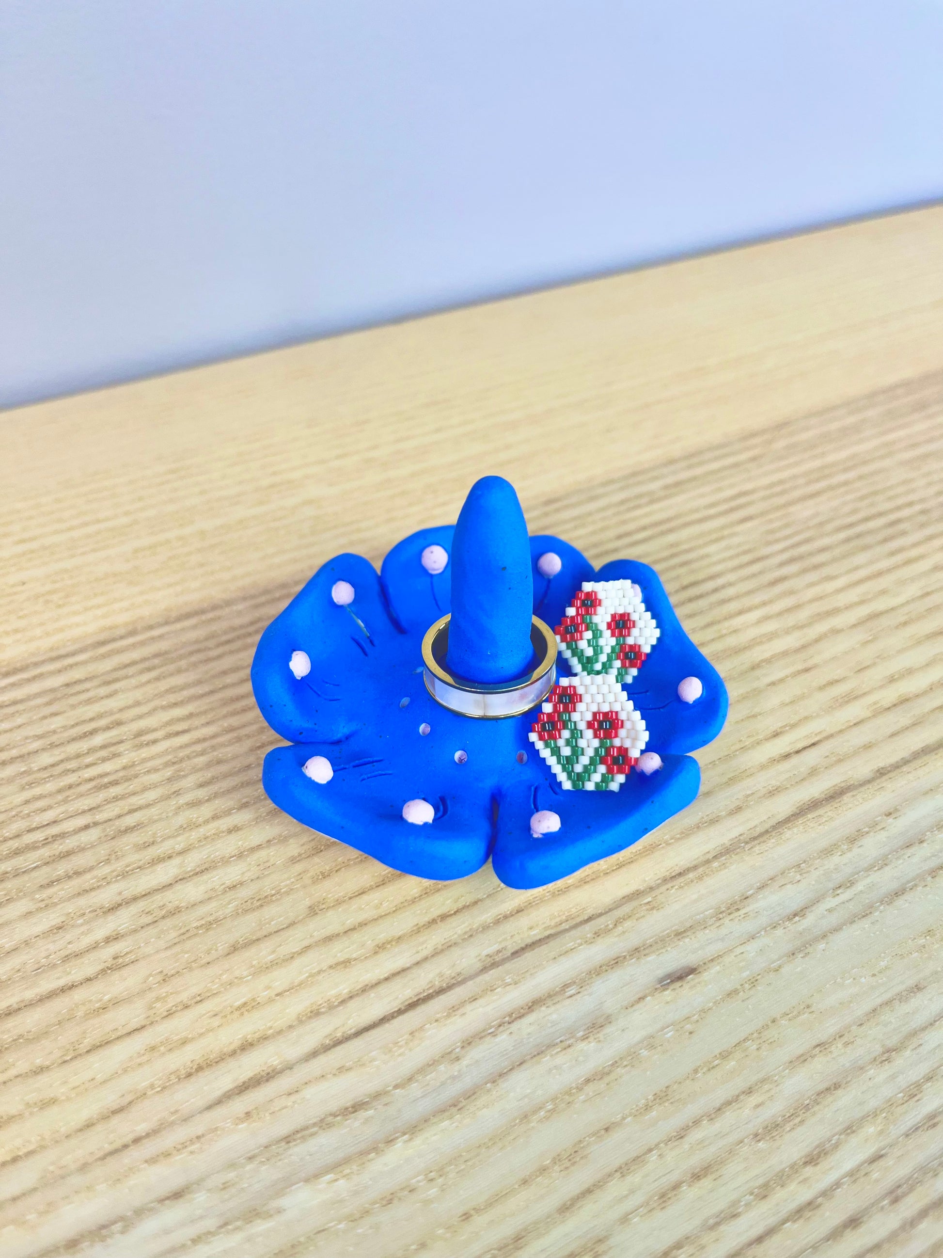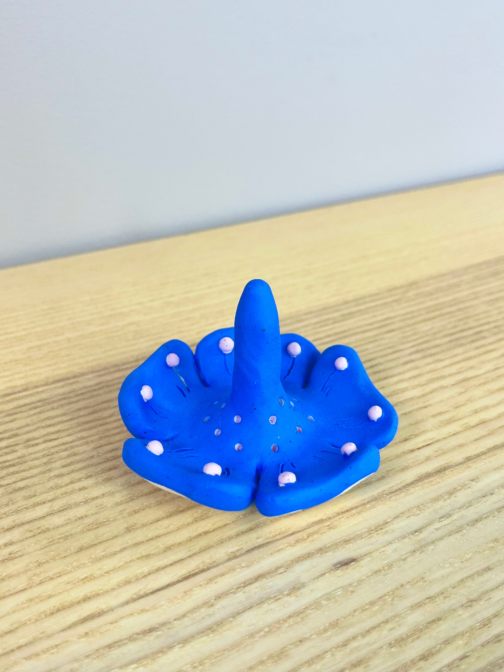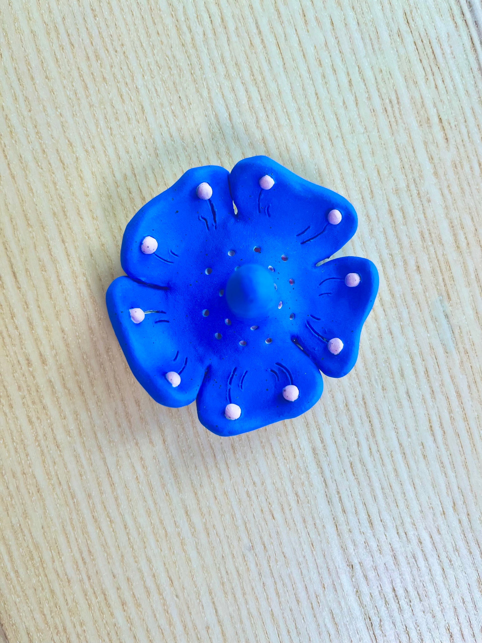An unglazed flower ring pot in vibrant blue with light pink drops
